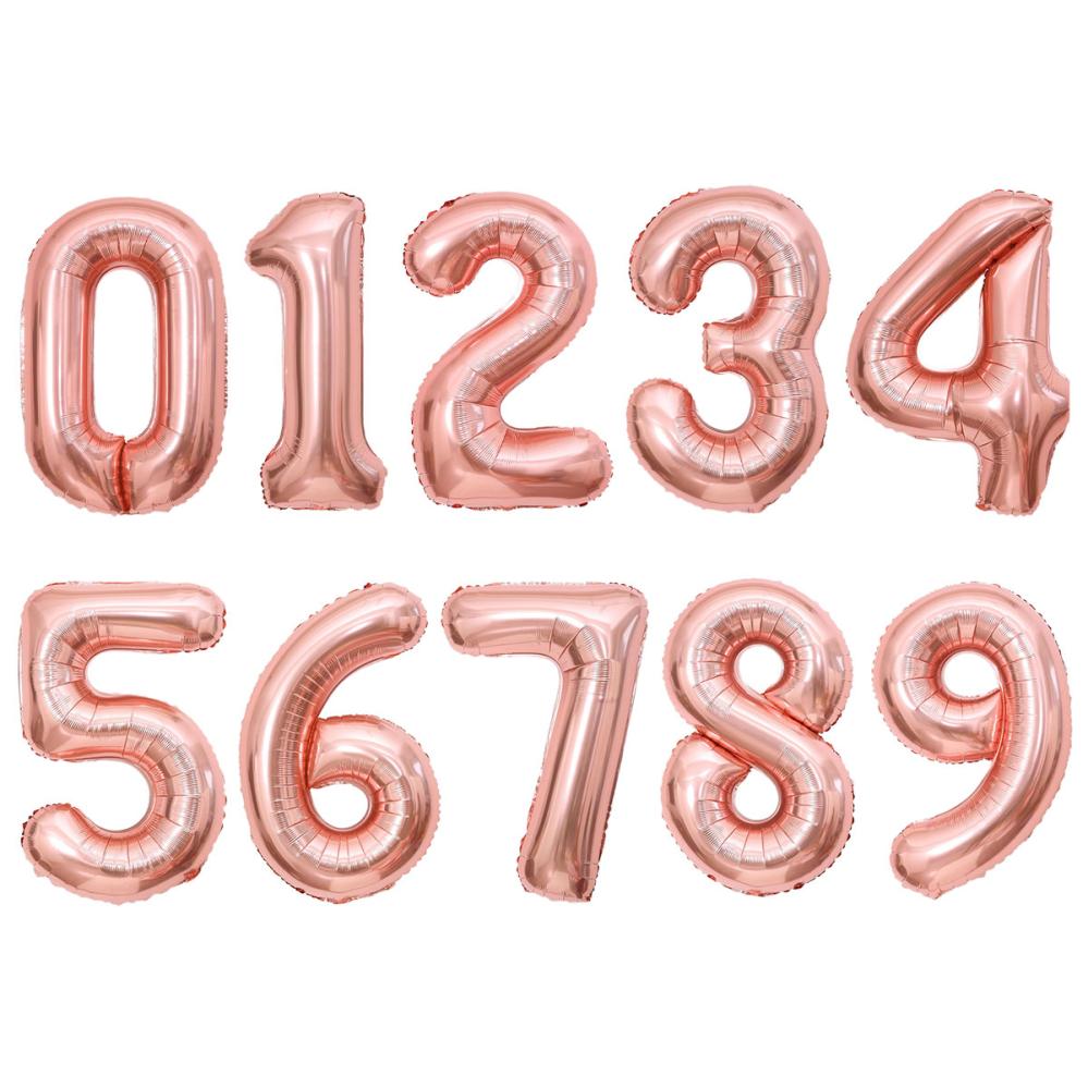 Rosaguld Talballon omfatter en folieballon i form af et tal med ophængningsøjer i rosaguld. Ballonen kan fyldes med luft med det medfølgende pusterør eller med helium.