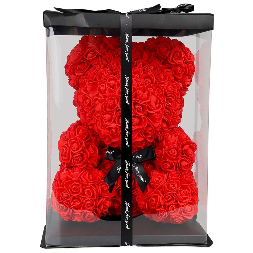 Rosebamse 37 cm er en stor bamsebjørn dækket af bløde plastikroser, med en letvægtskerne af flamingo og et sort silkebånd bundet rundt om halsen som en sløjfe, dekoreret med teksten "Just for you". Bamsen leveres i en gennemsigtig gaveæske med bånd.