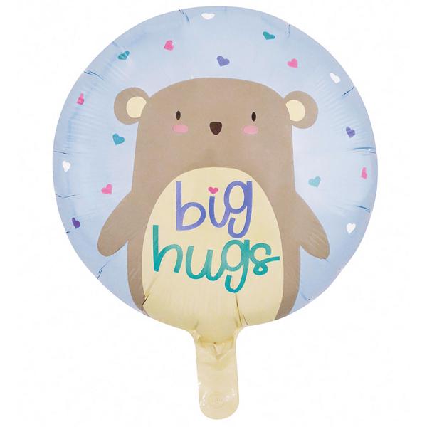 Rund Folieballon Big Hugs 46 cm omfatter en rund, blå folieballon, som er dekoreret med små hjerter i forskellige farver samt en sød bjørn med teksten "big hugs" på maven.