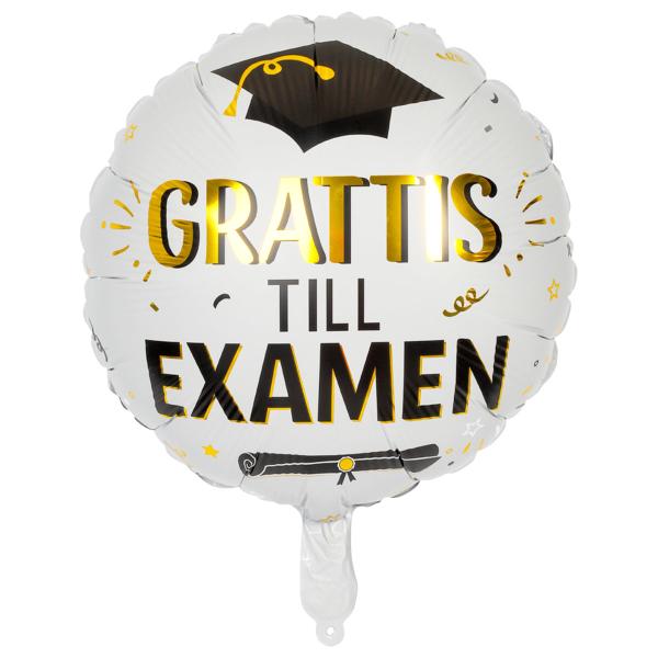 Rund Folieballon Grattis Till Examen 46 cm er en hvid rund folieballon med teksten "GRATTIS TILL EXAMEN" i sort og guld, en sort eksamenshat og et sort diplom.