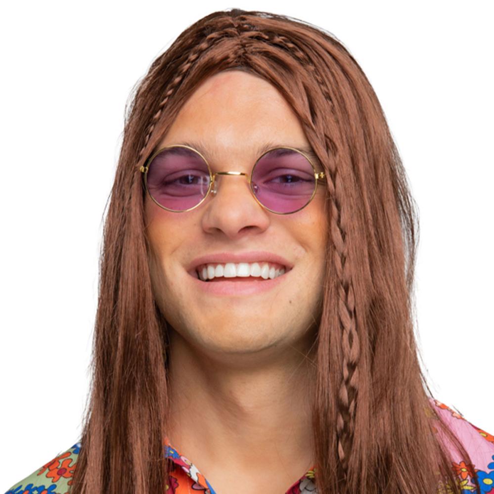 Til udklædning eller fest passer briller inspireret af hippier, med runde lilla linser og et guldfarvet stel i plast. Disse plastbriller er lette og kan kombineres med tøj, paryk eller hat.