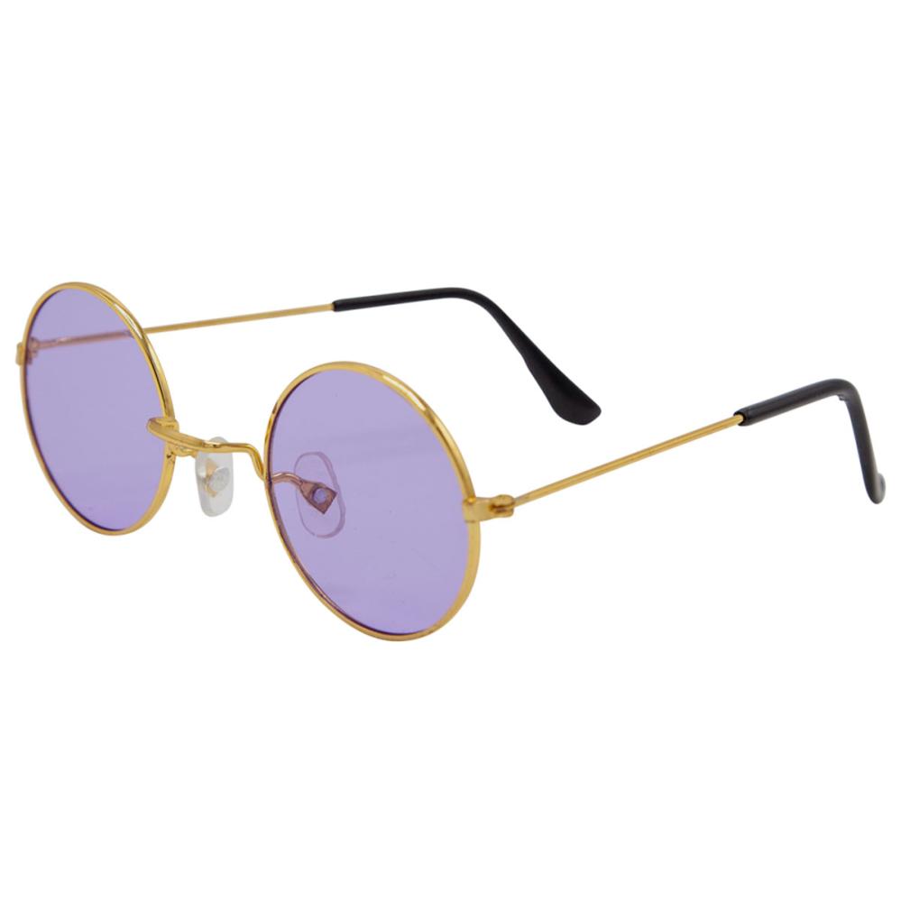 Runde Briller Hippie Lilla omfatter et par runde plastbriller med lilla linser, guldfarvet stel samt sorte stangender.