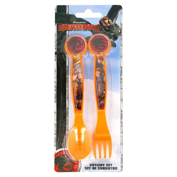 Sådan Træner Du Din Drage Gaffel og Ske inkluderer et sæt med gaffel og ske i orange farve til børn med motiv fra filmen Sådan Træner Du Din Drage. Bestikket er lavet af BPA-fri plast og tåler ikke mikroovn eller opvaskemaskine.