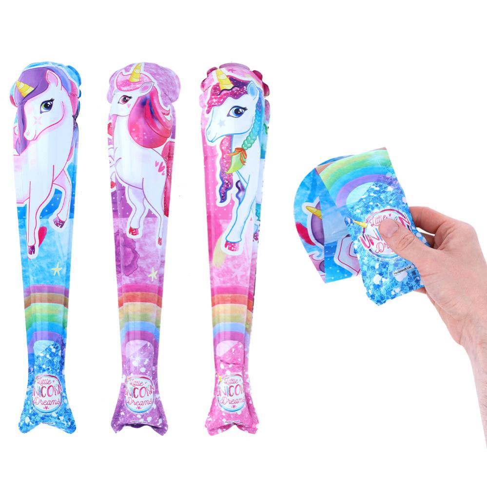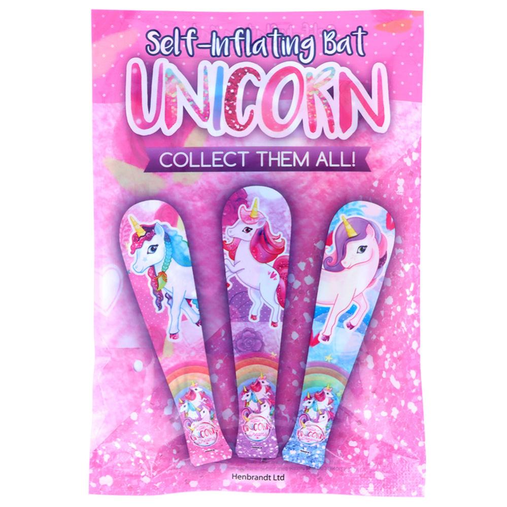 Selvoppustelige Baseballbat Enhjørning omfatter et baseballbat som puster sig selv op og har et farverigt motiv med enhjørninger. Fold produktet helt ud, knæk boblen indeni den, ryst kraftigt og se den puste sig op. Den findes i tre forskellige motiver men de sælges assorteret og stykvis så det bliver en overraskelse hvilket motiv du får.