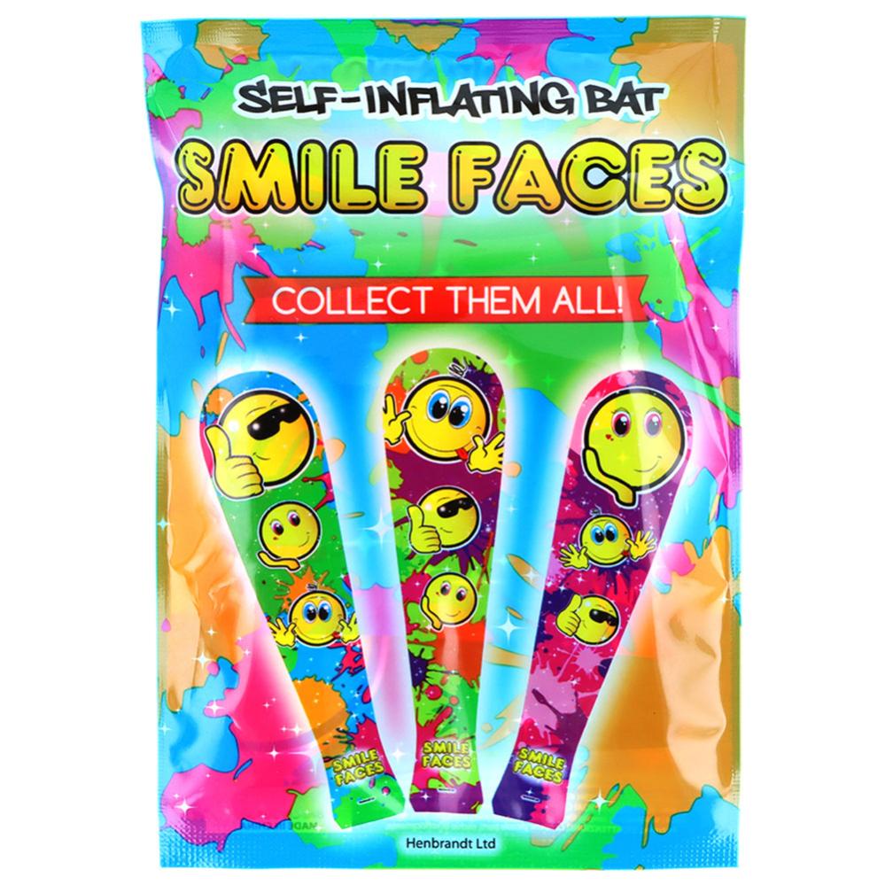 Selvoppustelige Baseballbat Smiley er et baseballbat som pustes op af sig selv og har et farverigt motiv med smileyfigurer. Fold produktet helt ud, knæk boblen indeni den, ryst kraftigt og se den puste sig op. Produktet findes i tre forskellige motiver, men motiverne sælges usorterede og stykvis, så det bliver en overraskelse hvilket motiv du får.