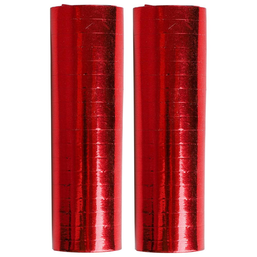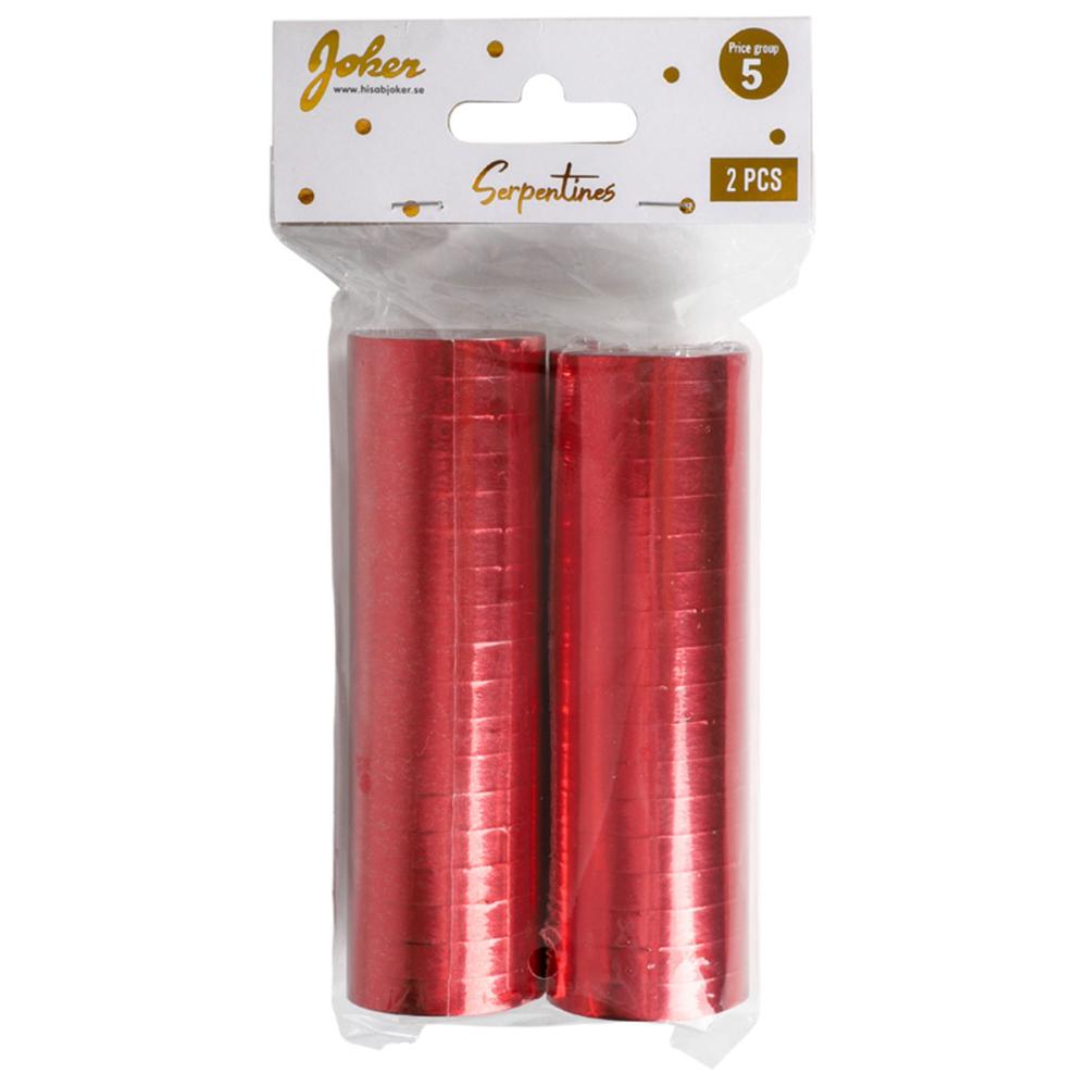 Serpentiner Metallic Rød 2-pak består af to ruller skinnende serpentiner med en metallisk rød yderside.