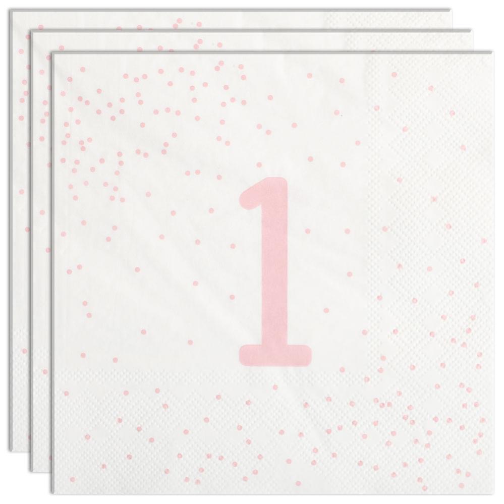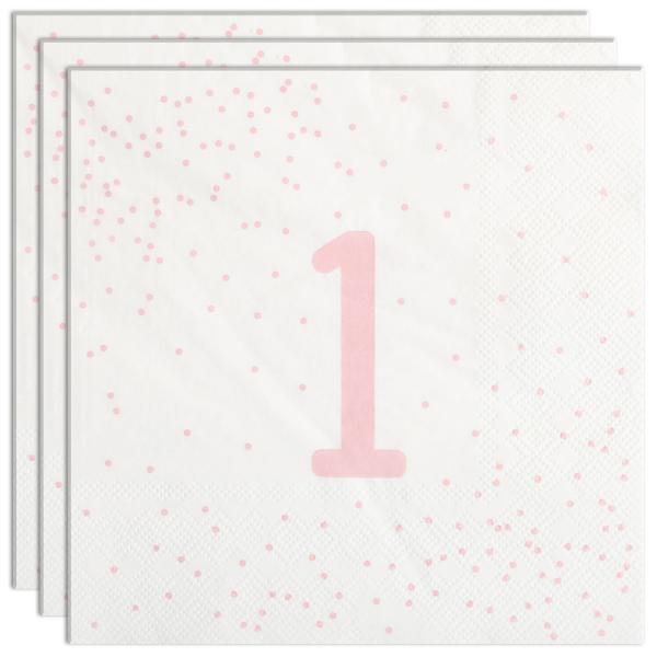Servietter 1 år Lysrosa med Prikker 16-pak består af seksten hvide engangsservietter i tre lag med lyserødt motiv af tallet "1" samt små prikker.