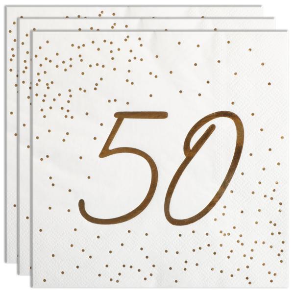 Servietter 50 år Guld med Prikker 16-pak består af seksten hvide engangsservietter i tre lag med tallet "50" og små prikker trykt i skinnende guld på den ene side, mens de øvrige sider er helt hvide.