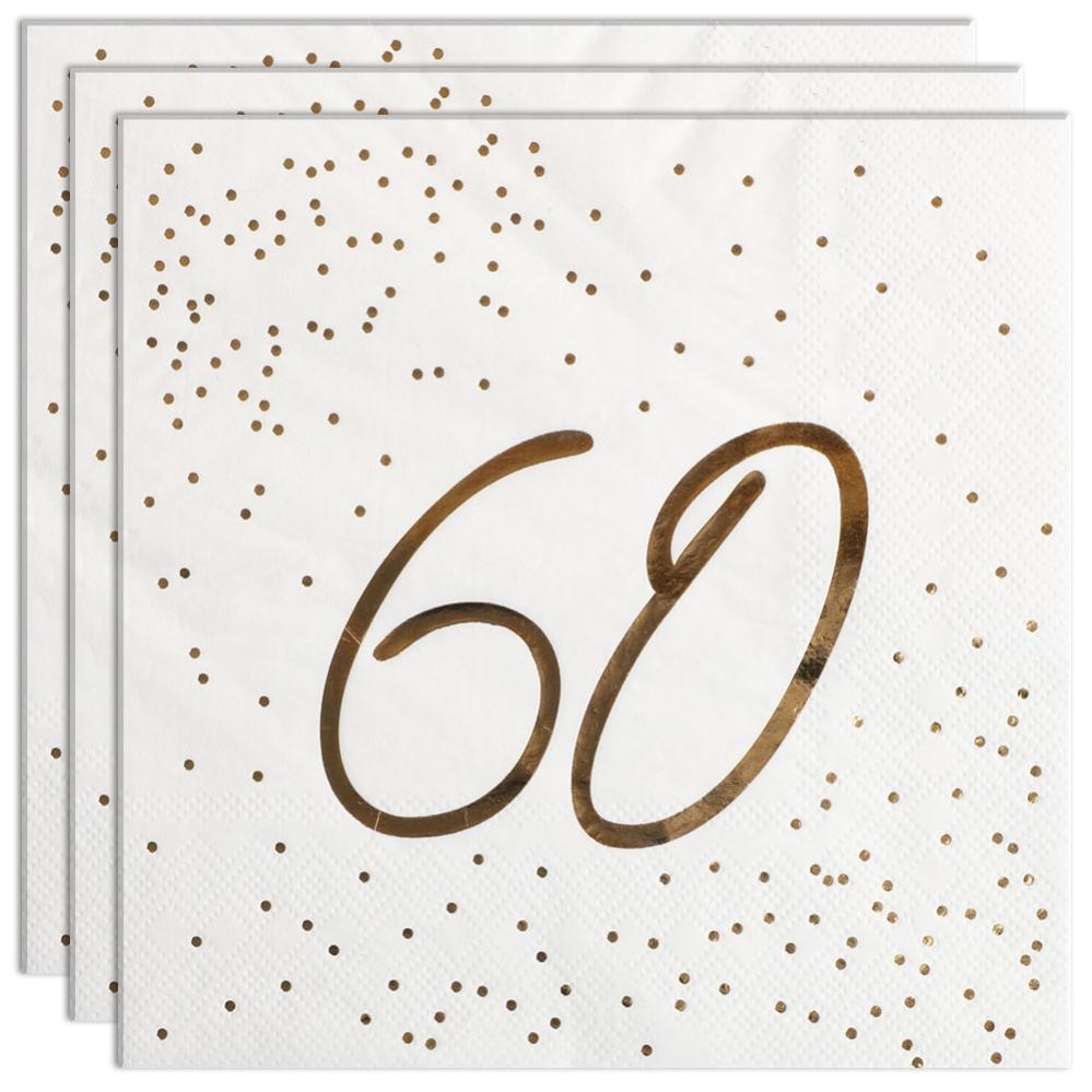 Servietter 60 år Guld med Prikker 16-pak består af seksten hvide engangsservietter i tre lag med tallet "60" og små prikker trykt i skinnende guld på den ene side, mens de øvrige sider er helt hvide.