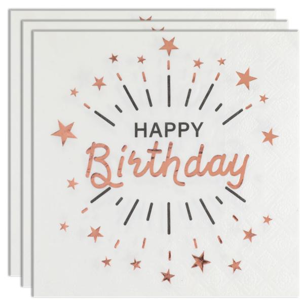 Servietter Birthday Party Rosaguld indeholder hvide servietter med rosaguld Happy Birthday tekst og rosaguld stjerner. Servietterne kommer i en pakke med 10 og måler ca. 33 x 33 cm, når de er foldet ud.