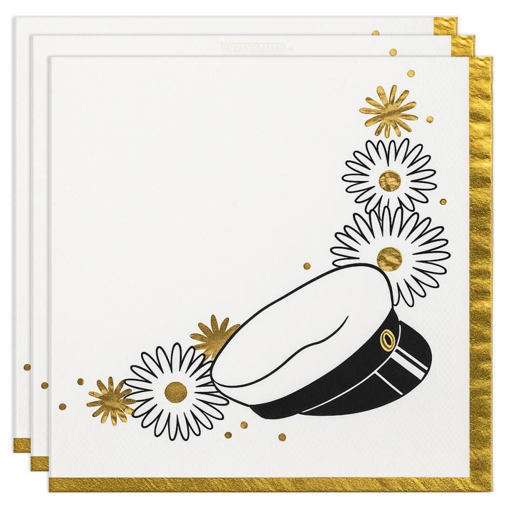 Servietter Studenterhue/Margueritter 16-pak består af seksten hvide engangsservietter med motiv af margueritter og en studenterhue, trykt i sort med detaljer i guldfolie på forsiden og guldfarve på bagsiden.
