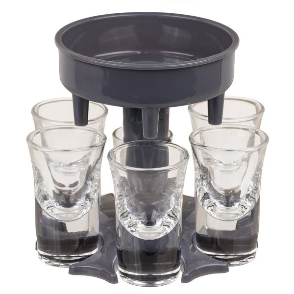 Shotglas Dispenser omfatter en dispenser med 6 stykker shotglas. Placer shotglassene i holderne på dispenseren og fyld drikken på toppen, som derefter løber ned i de respektive glas. Løft dispenseren af og server drikken. Dispenseren er i grå plast og glassene i transparent glas.