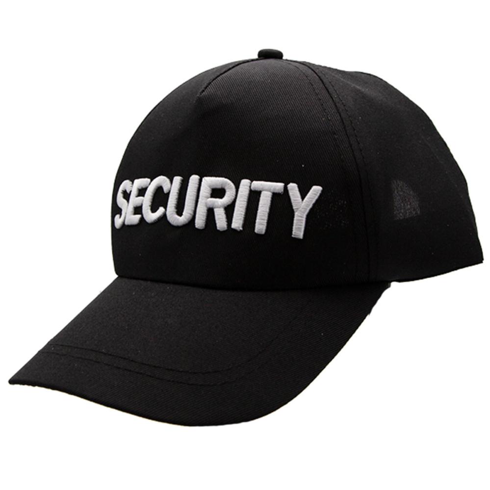 Sikkerhedskasket Sort er en sort kasket med teksten "SECURITY" i hvid foran og velcro bagtil for nemt at justere størrelsen.