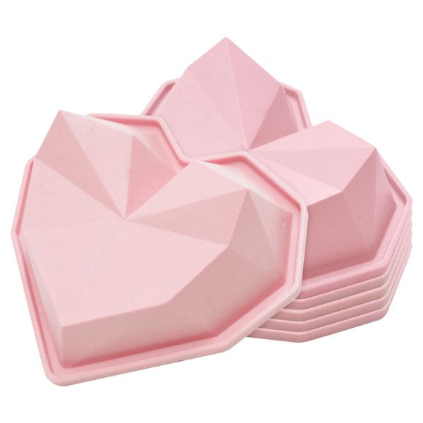 Silikoneforme Diamanthjerte omfatter 6 forme i rosa platinumsilikone i form af diamanthjerter. Formene tåler ovn, mikroovn, fryser, køleskab og opvaskemaskine. Tåler -20 grader op til 230+ grader. Brug smør til formene ved første brug.