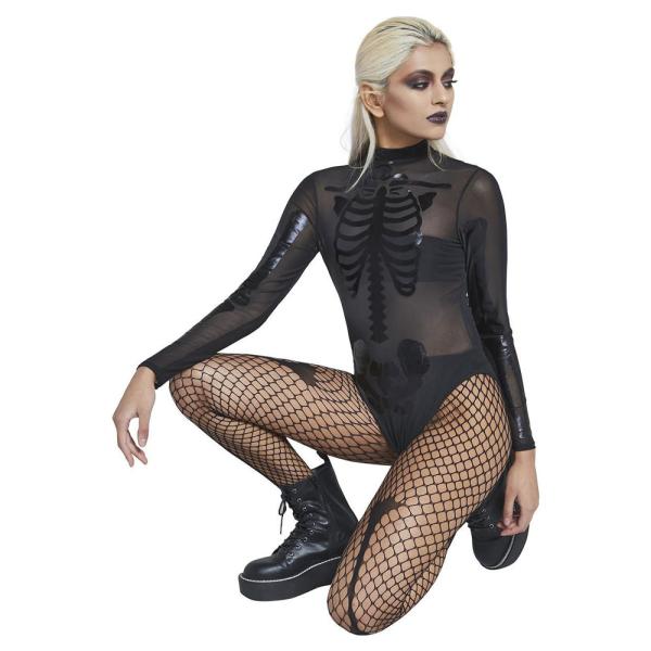 Få en stilfuld skeletudklædning med denne elegante halloween-body. En let gennemsigtig sort skelet-body, der er det oplagte valg til din skeletudklædning. Det er det perfekte valg for dig, der ønsker at klæde dig ud på en enkel måde og samtidig passe ind i halloween-festen.