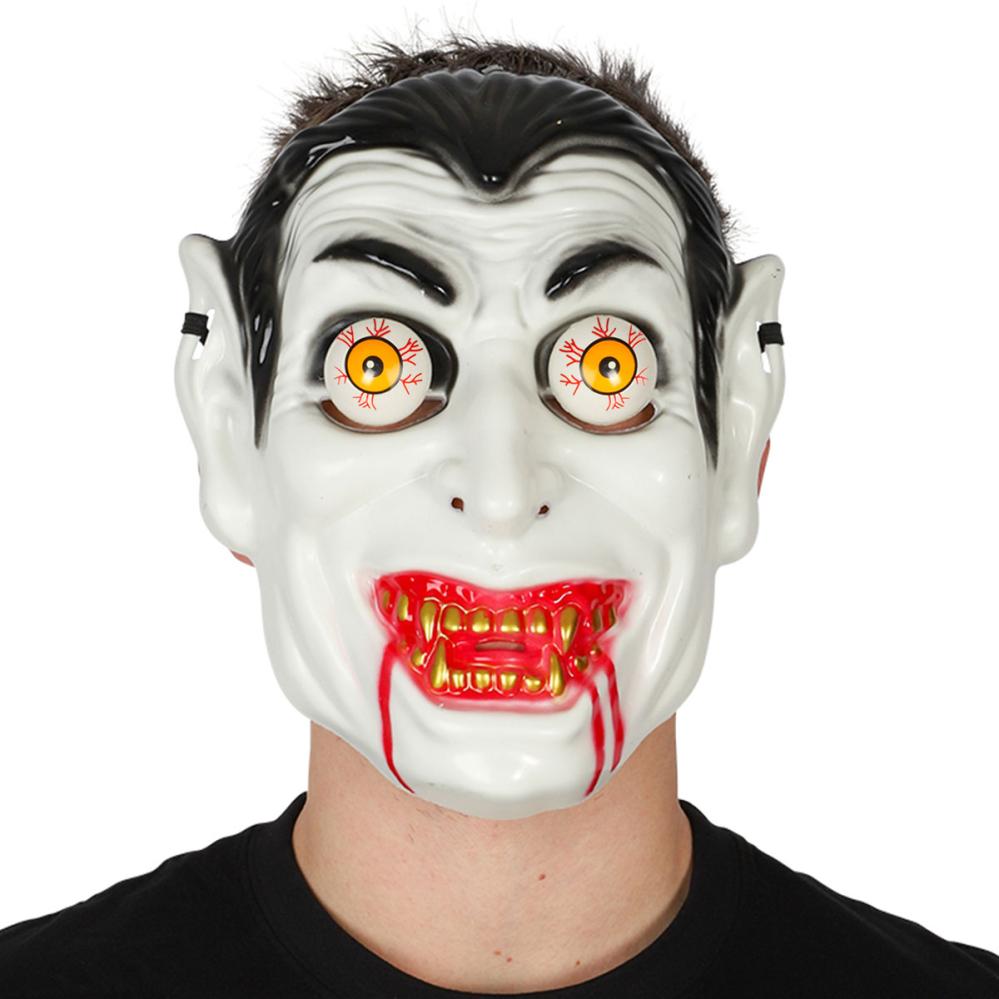 Dette er en skør Dracula-maske for den, der vil skille sig ud til næste maskerade eller til Halloween. Denne vampyrmaske har bevægelige øjne, som skaber en skræmmende effekt. Dette er en halloweenmaske, som garanteret tiltrækker opmærksomhed hele aftenen.
