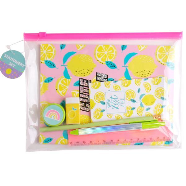 Skrivesæt Cute Lemon indeholder otte artikler med citronmotiv: en gennemsigtig lineal, en lyseblå blyantspidser, et hvidt viskelæder, en limegrøn blyant og kuglepen, samt en blålinjeret notesbog i A5-format og en blank lommenotesbog med lyserødt omslag. Forsiden er dekoreret med citroner og citronblade samt teksten "CUTE LEMON". Disse syv artikler kan opbevares i den medfølgende gennemsigtige sliderpose.