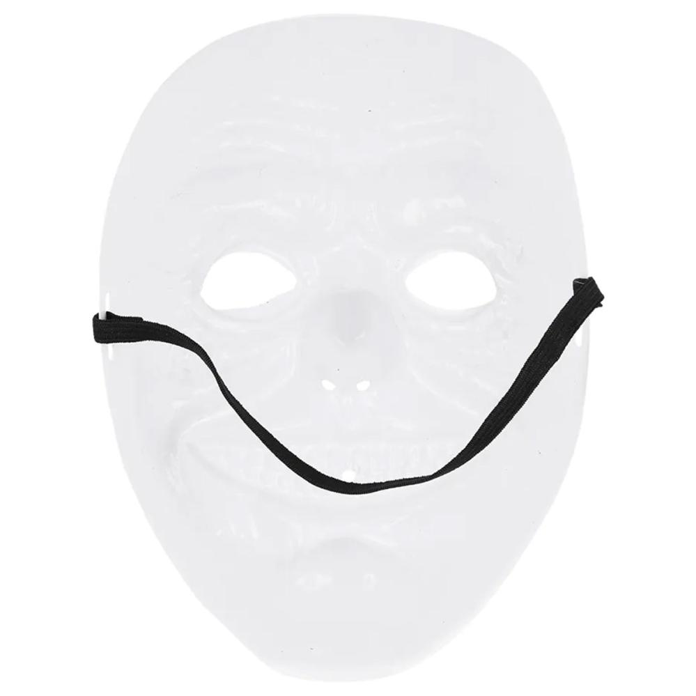Smilende Klovnemaske er en hvid klovnemaske med et smil, røde læber, rød næse og blå farve rundt om øjnene. Masken har huller til øjne, næse og mund og holdes på plads med et sort elastisk bånd.