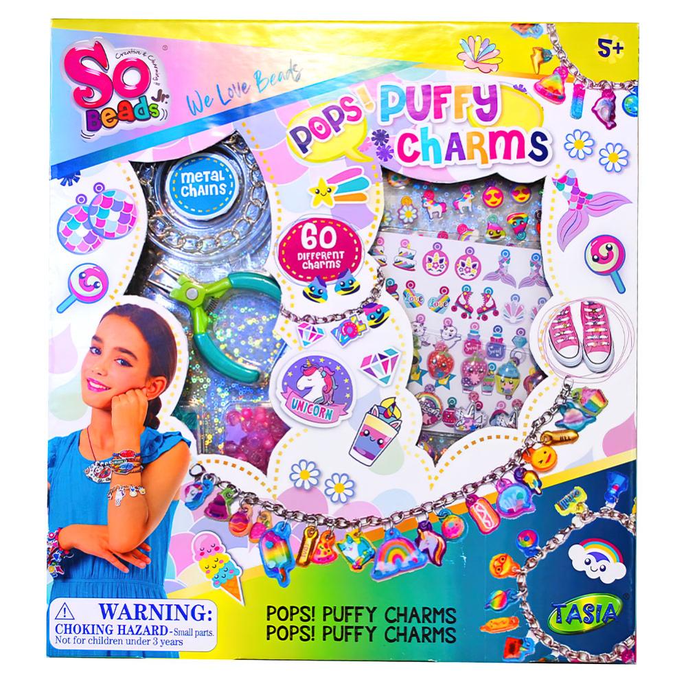 Smykke Kreativt Sæt indeholder et sæt til at lave vedhængsarmbånd, halskæder og øreringe. Sættet indeholder over 60 forskellige puffy sticker-vedhæng og flere forskellige tilbehør. Passer til børn over 5 år.