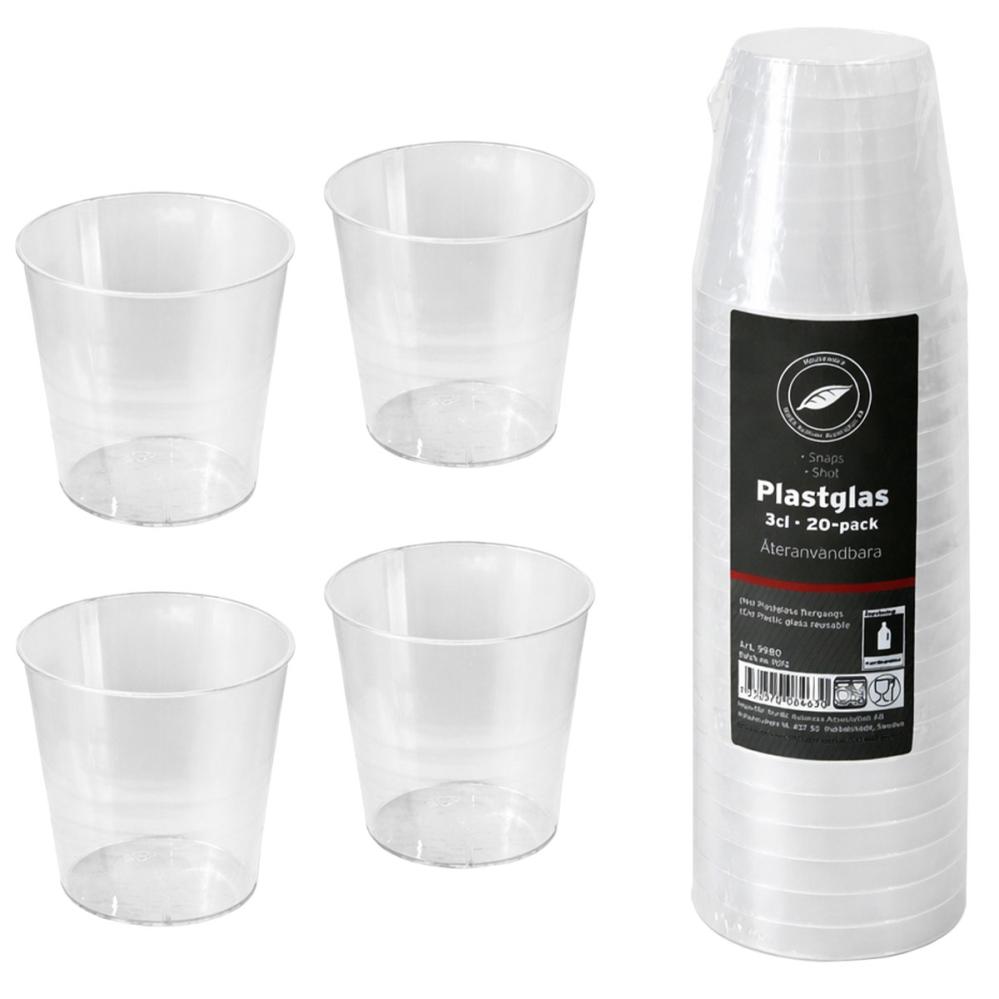Snapseglas Plast 3 cl 20-pak indeholder tyve transparente snapseglas, som er genanvendelige.