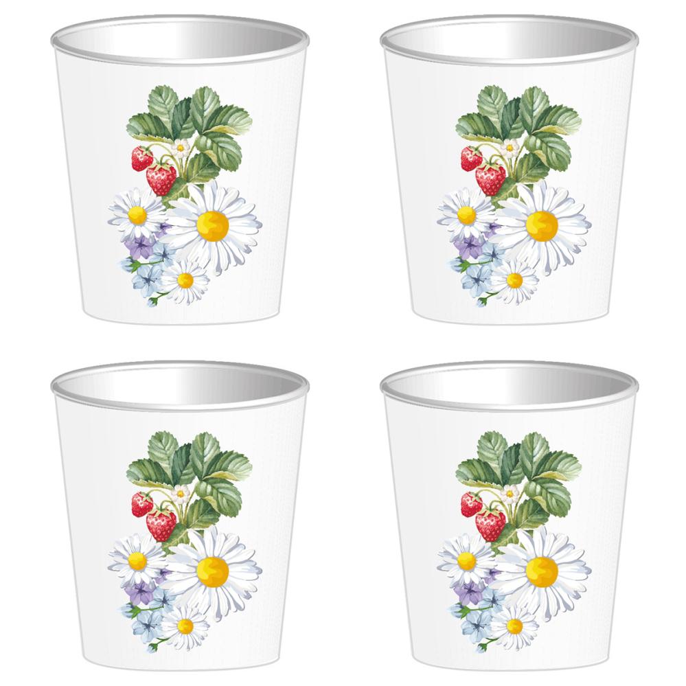 Snapskrus Blomster 59 ml 8-pak består af otte hvide papkrus til snaps, som er dekoreret med et farverigt motiv af jordbærplanter og andre vilde sommerblomster.