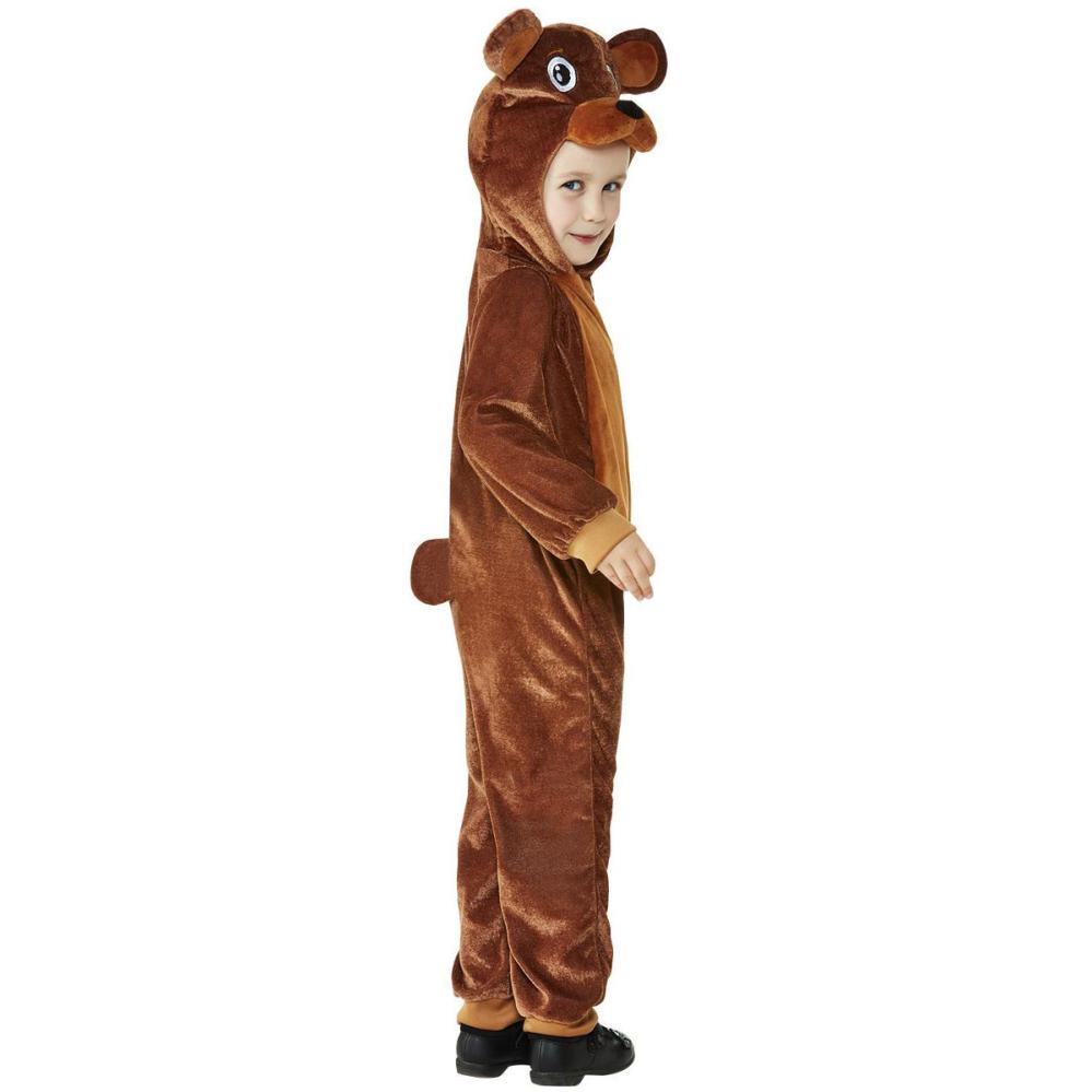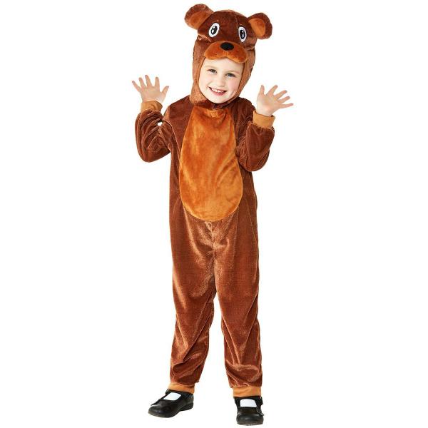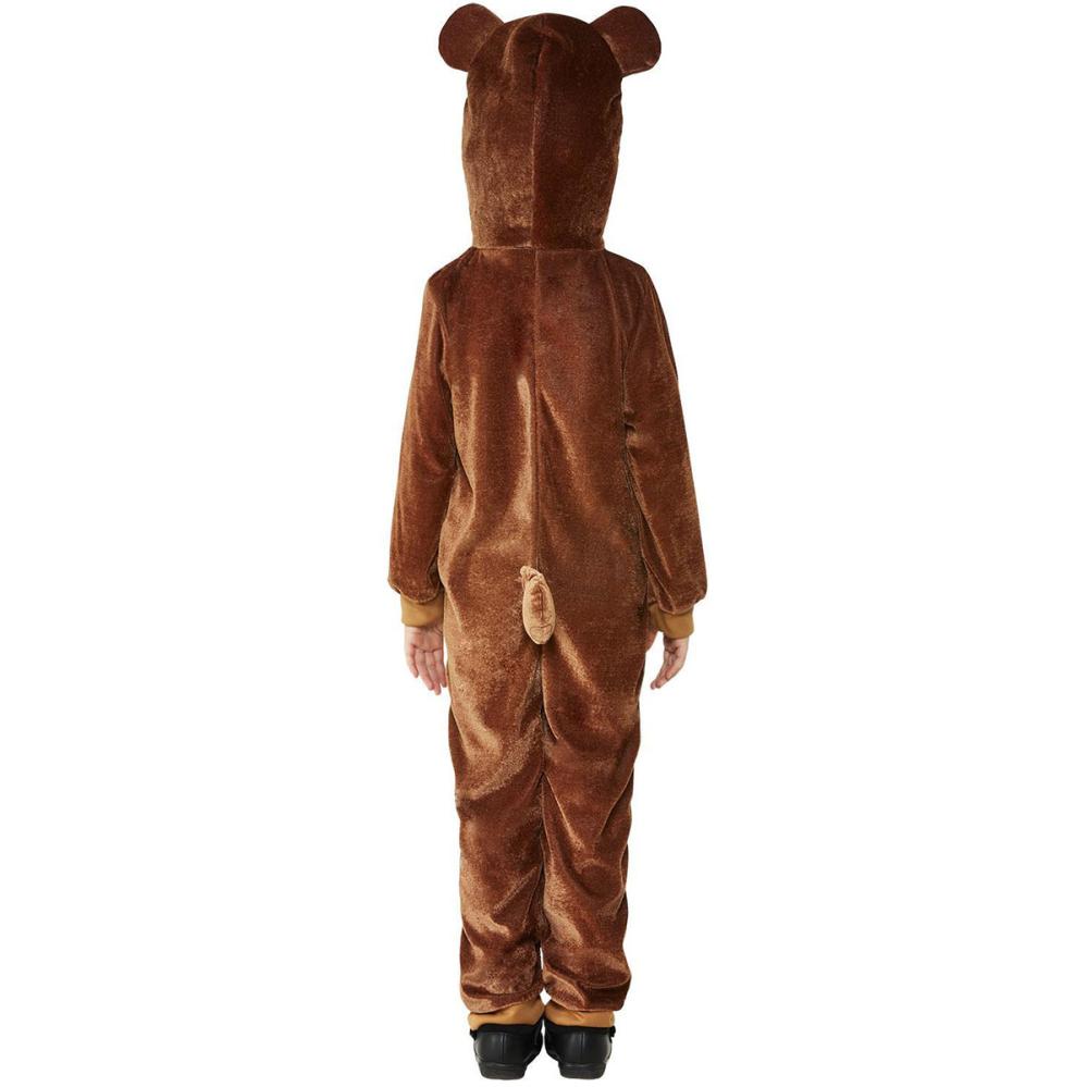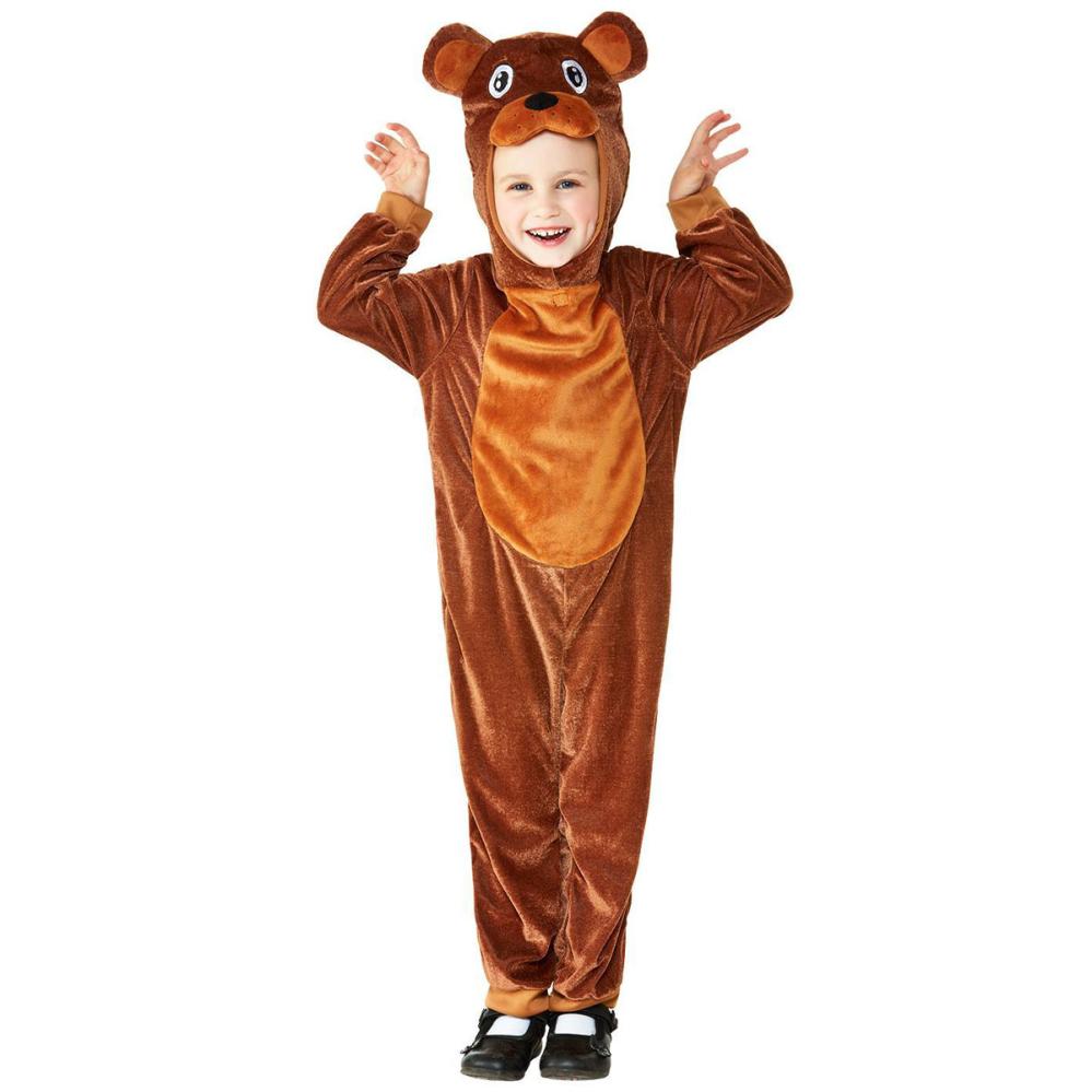 Sød Bjørn Kostume Børn omfatter en mørkebrun heldragt til småbørn med en hætte der forestiller et bjørnehoved med ører, øjne og snude.