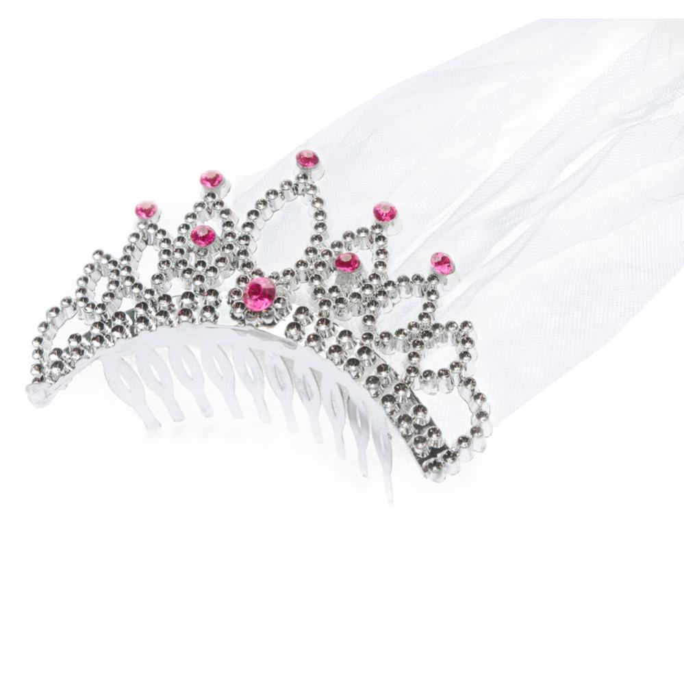 Sølv Diadem med Slør består af en sølv tiara med små rosa diamanter og et hvidt slør.