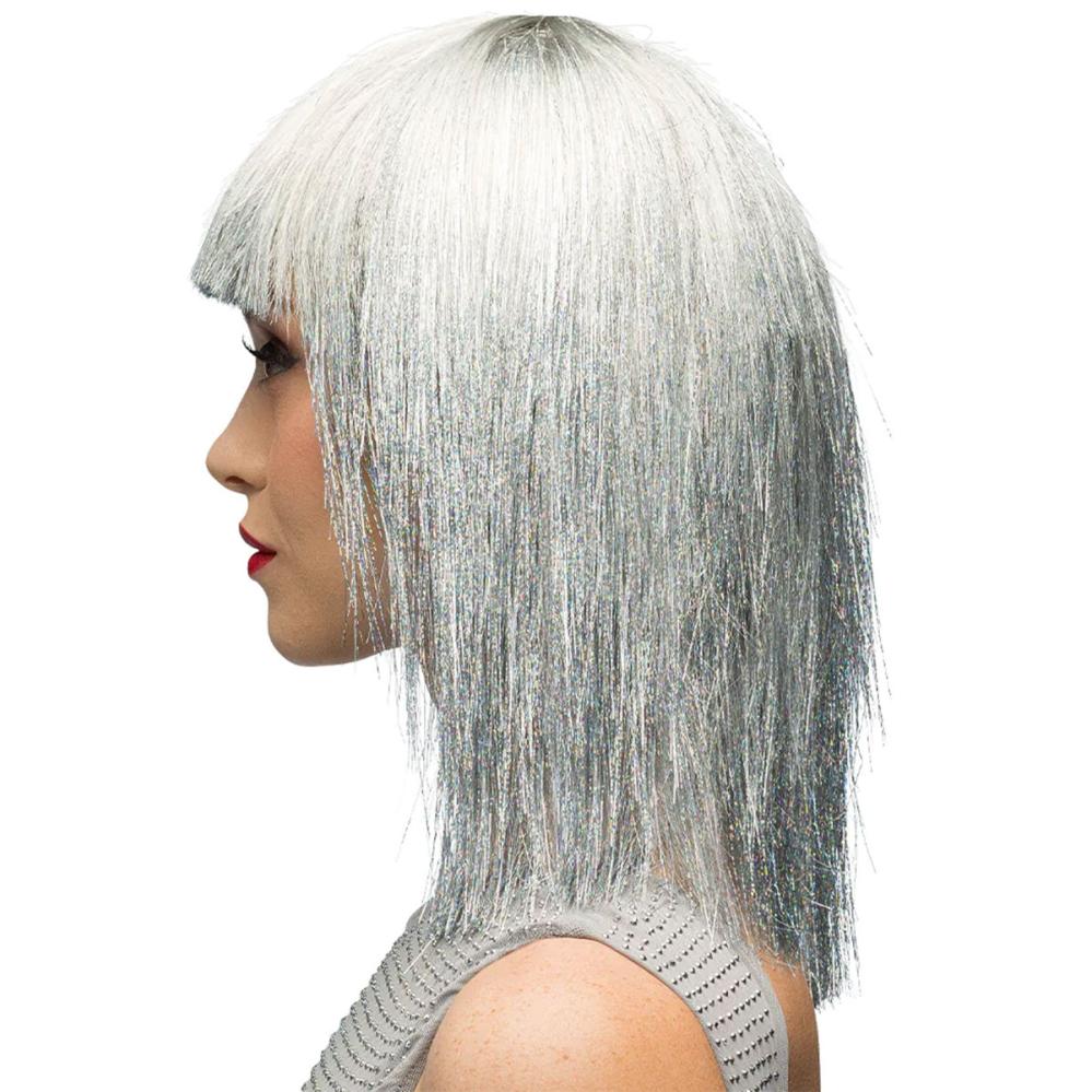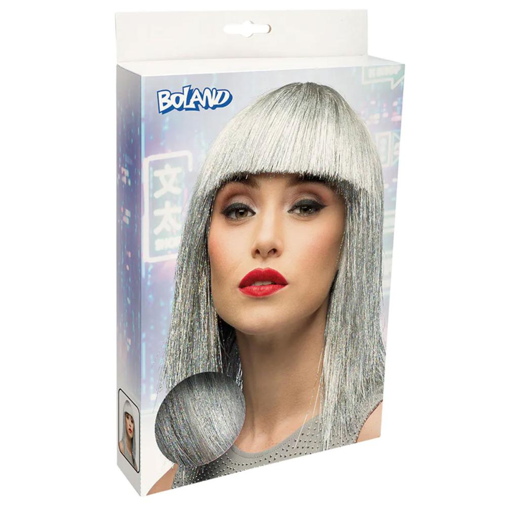Sølv Glitterparyk er en skulderlang paryk i sølvfarvet nuance med glansfuld finish og lige pandehår, en klassisk pagefrisure med stilren elegance.