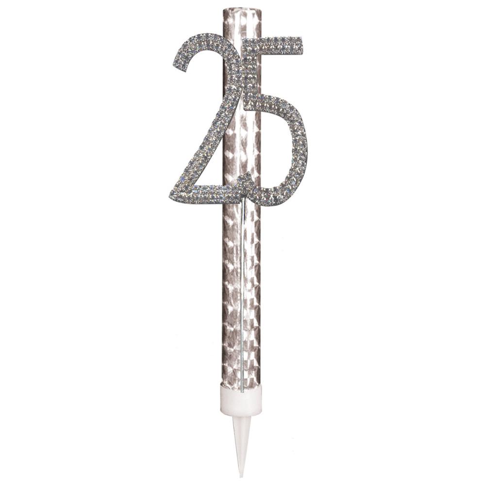 Sølv Isfontæne med Tal 25 omfatter en isfontæne med holografisk sølvfarve og tallet 25, dekoreret med sølvfarvede strassten.