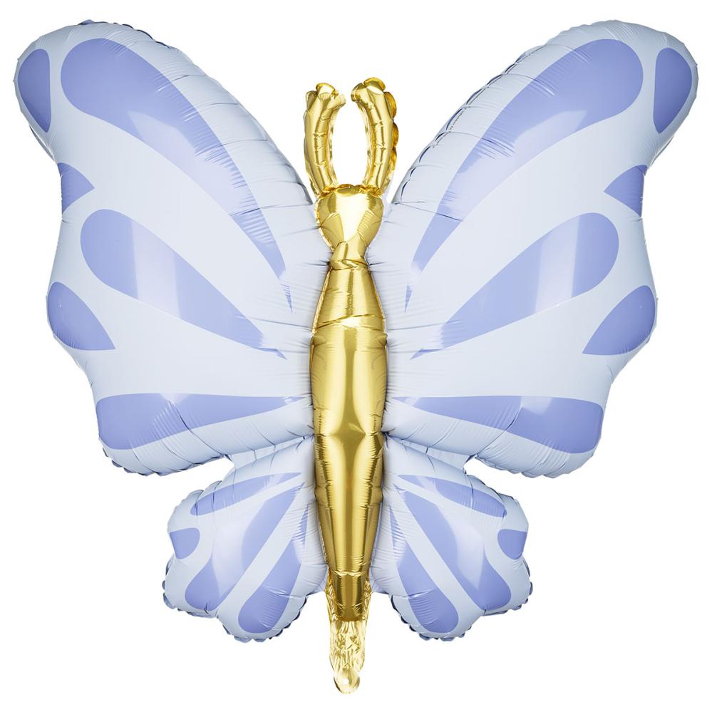 Sommerfugl Folieballon Blå/Guld omfatter en folieballon i form af en guldfarvet sommerfugl med blå vinger. Ballonen kan fyldes med luft med det medfølgende sugerør eller med helium.