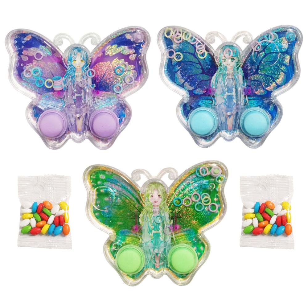 Sommerfuglefe Vandspil med Slik omfatter en variant af et klassisk vandringsspil, som er formet som en sommerfugl og findes i tre funklende sommerfugle og fe motiver i blå, grøn og lilla. Tryk på knapperne for at få ringene til at lande på de to pinde. Der medfølger desuden en pose med små farverige slikpastiller. Vandspillet sælges usorteret og stykvis, så hvilket motiv du får bliver en overraskelse.