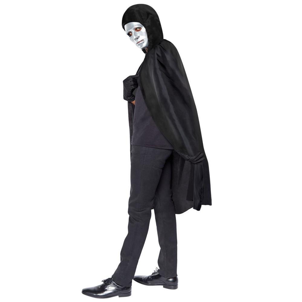 Sort Cape med Hætte omfatter en sort cape med hætte og et sort bindebånd.