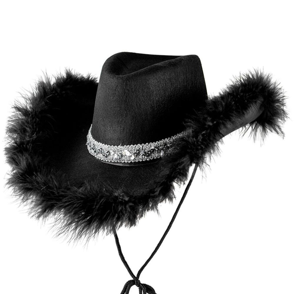 Skil dig ud til næste cowboy eller western temafest med en sort cowboyhat som fanger alles blikke. En glamourøs cowgirlhat med pailletbånd og fjerkant som fuldender enhver cowboy udklædning med stil og attitude.