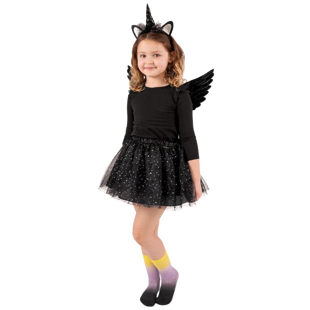 Gør lykke til næste fest med enhjørningetema med dette magiske enhjørningskostume til børn. Med sort tylskørt, horn og vinger bliver det et perfekt enhjørningskostume til fantasifulde lege og festligheder.