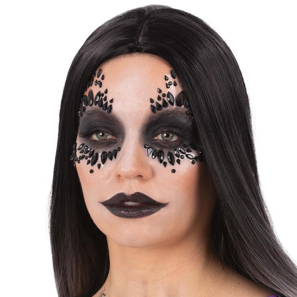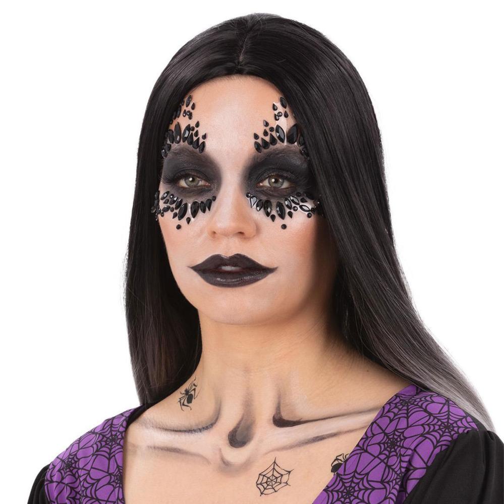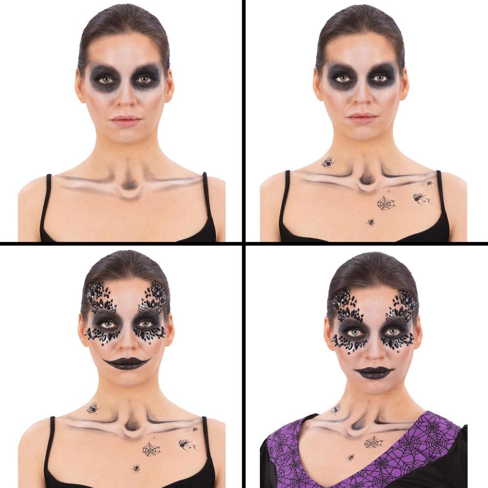 Forvandl dig til nattens dronning med dette Halloween-sminkesæt i sort enke-stil. Dette er et komplet sminkesæt med ansigtsfarver, smykker og tatoveringer, som gør kostumesminke både enkel og effektfuld til Halloween eller festen.