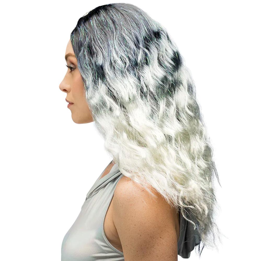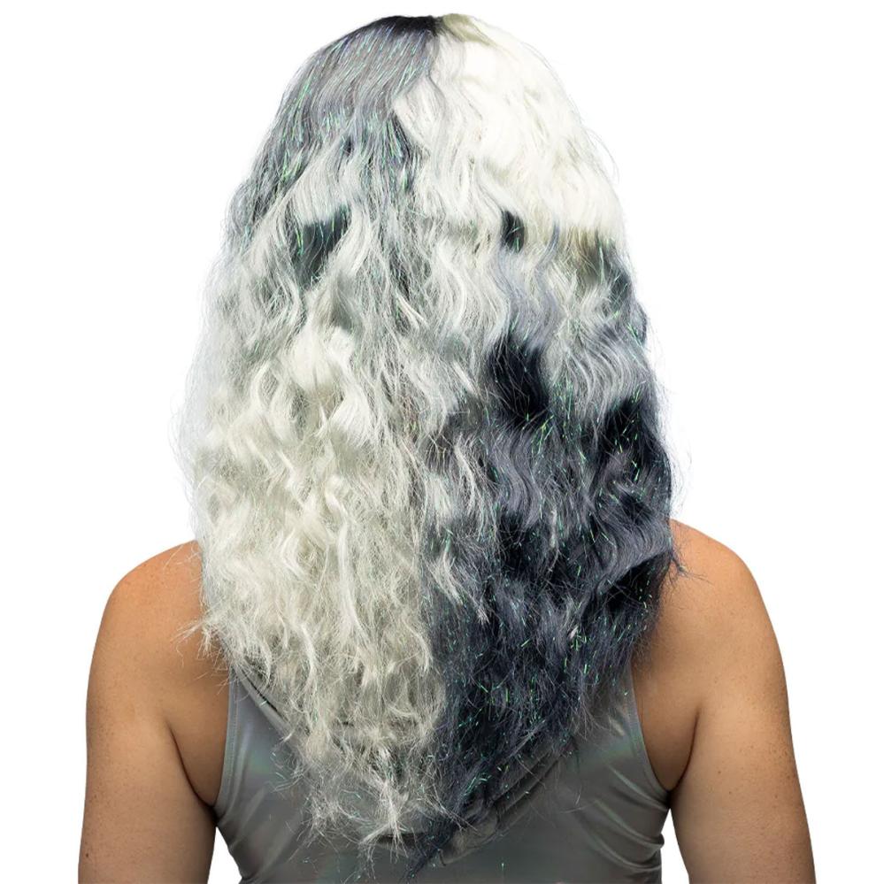 Skil dig ud til en Disney-temafest med denne sort og hvid paryk som får tankerne til at gå til Cruella de Vil. Dette er en perfekt Halloween-paryk med glamourøse glitterstriber som gør hver bevægelse magisk skimrende.