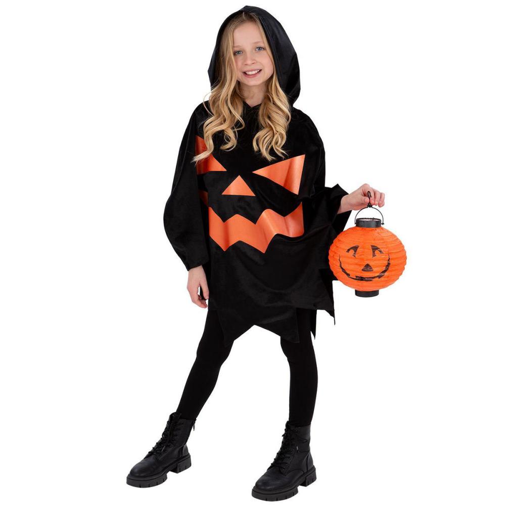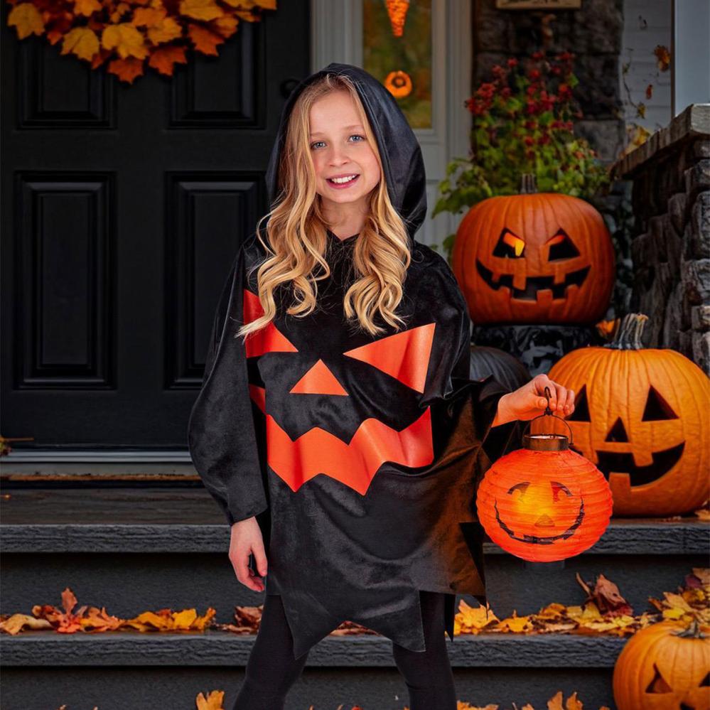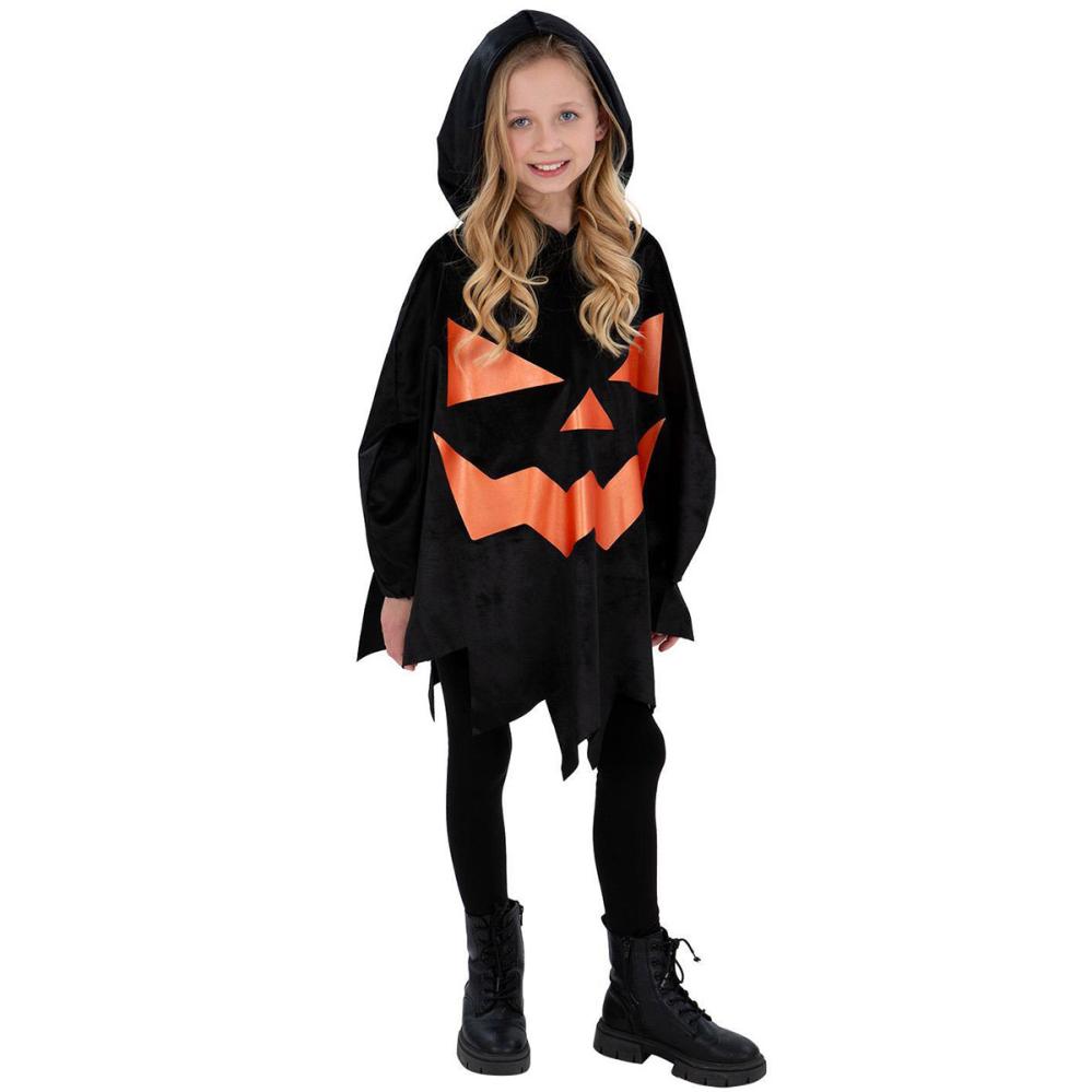 Gør Halloween magisk med et græskarkostume børn elsker! Denne sorte poncho med et uhyggeligt græskar-ansigt er et perfekt græskarkostume. Dette er et kønsneutralt halloweenkostume til børn og græskarudklædningsdragt i ét.