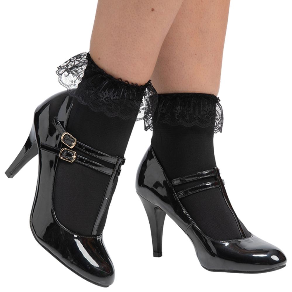 Sorte Sokker med Blonder omfatter et par sorte sokker med en sød blondeflæse. Sokkerne er fremstillet af nylon og passer til unge samt voksne.