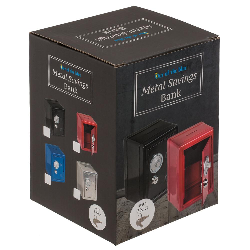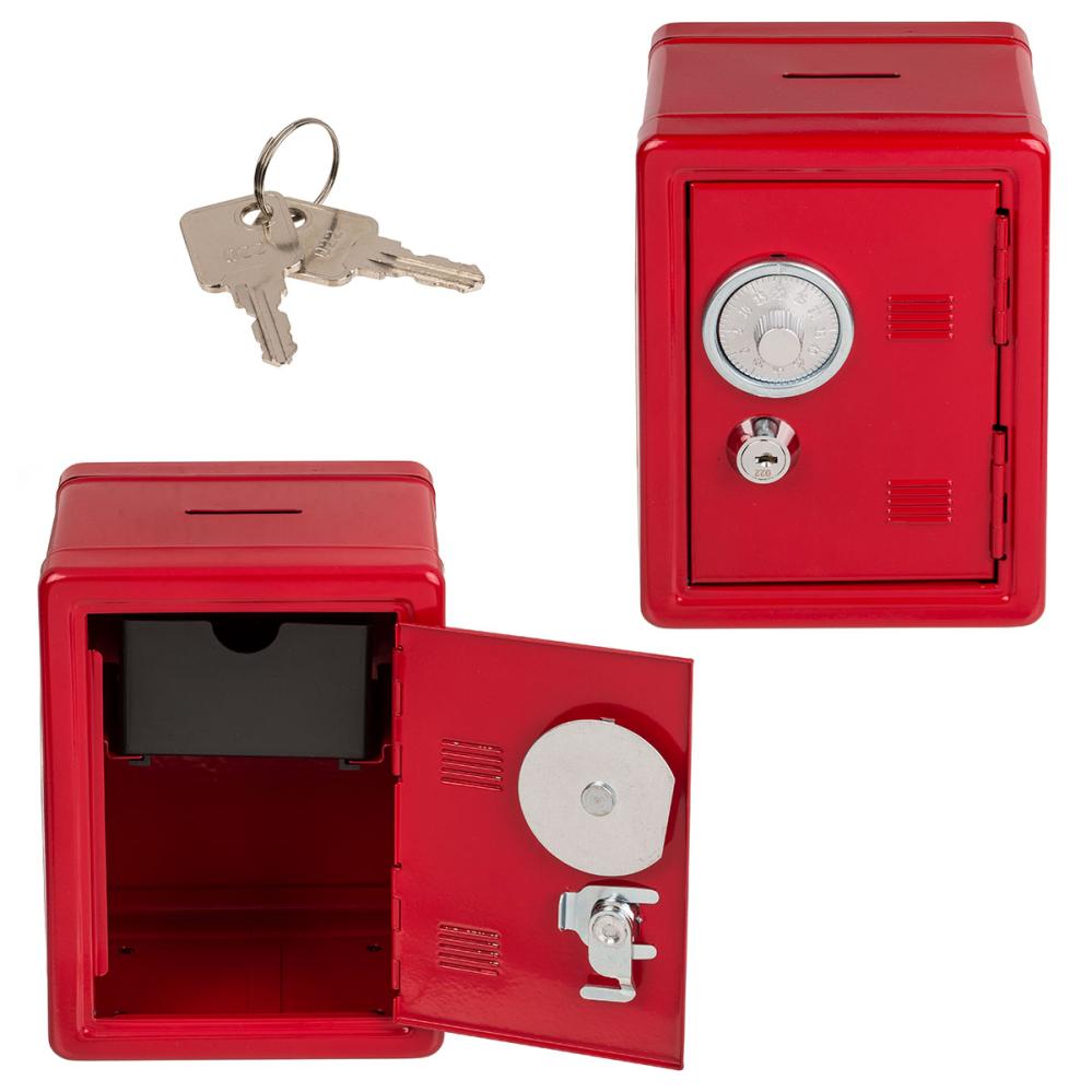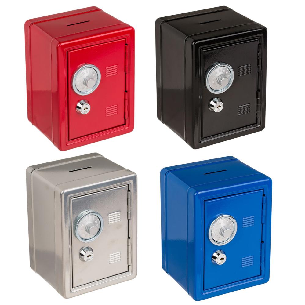 Sparebøsse Pengeskab 12 x 10 x 16 cm omfatter et lille pengeskab i metal med både kombinationslås, nøglelås og en møntsprække på toppen. Bemærk, at kombinationslåsen ikke fungerer som en traditionel lås, men snarere som et håndtag, og at den kun består af ét tal. Dette tal er forudindstillet og angives på en seddel på pengeskabets bagside. Sparebøssen findes i farverne sort, rød, blå og sølv.