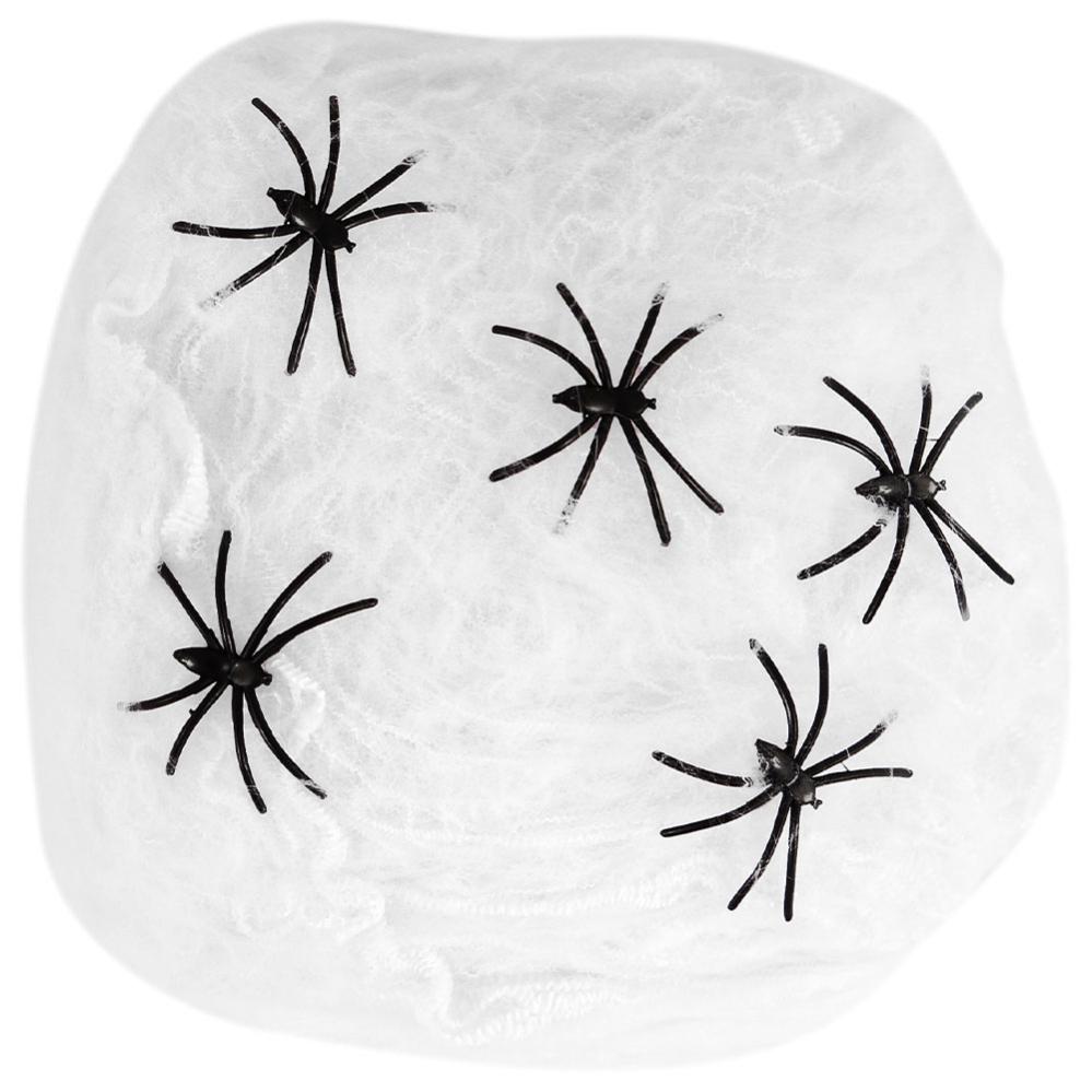 Sæt skrækstemningen under Halloween med denne spindelvævsdekoration. Det hvide spindelvæv med fem edderkopper af plast passer perfekt som halloweendekoration både inde og ude. Det er et enkelt og effektfuldt halloweenpynt til festen eller hjemmet.