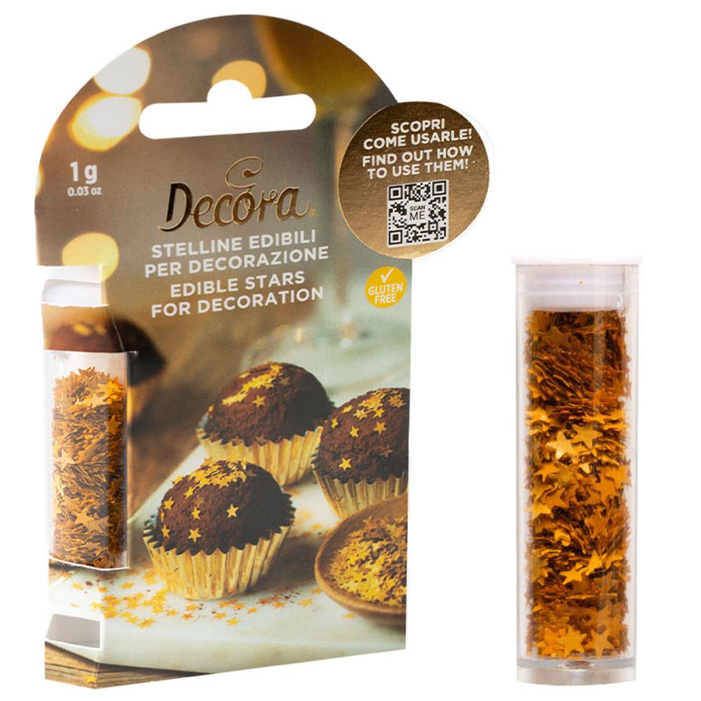 Spiselige Stjerner Guld indeholder en bøtte med 1 gram spiselige stjerner i guldfarve.
