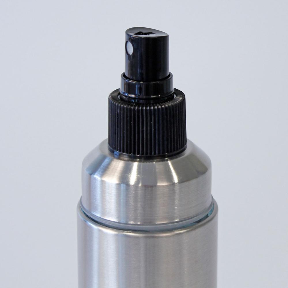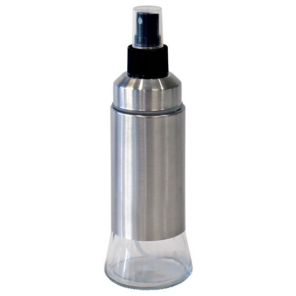 Sprayflaske Olie/Eddike 19 cl består af en stilren flaske i sølvfarvet metal med sort spraykork og beskyttelseslåg. Den nederste del af flasken er fremstillet af transparent glas, hvilket gør det nemt at se indholdet.