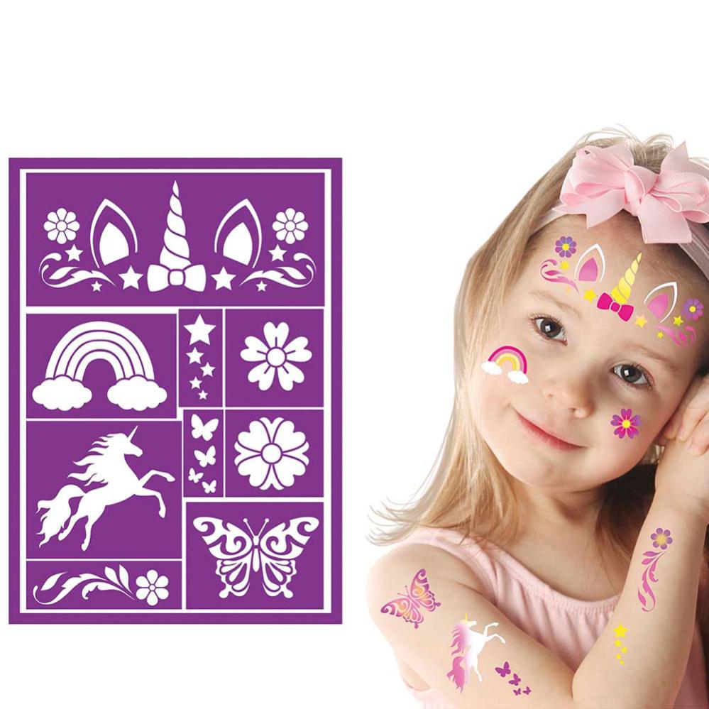 Skab magiske dekorationer til din enhjørningefest med disse lilla stencils. Med motiver af en enhjørning, en regnbue, sommerfugle og blomster kan du nemt forvandle kort, vægge og invitationer til en fantasifuld og farvestrålende fest.
