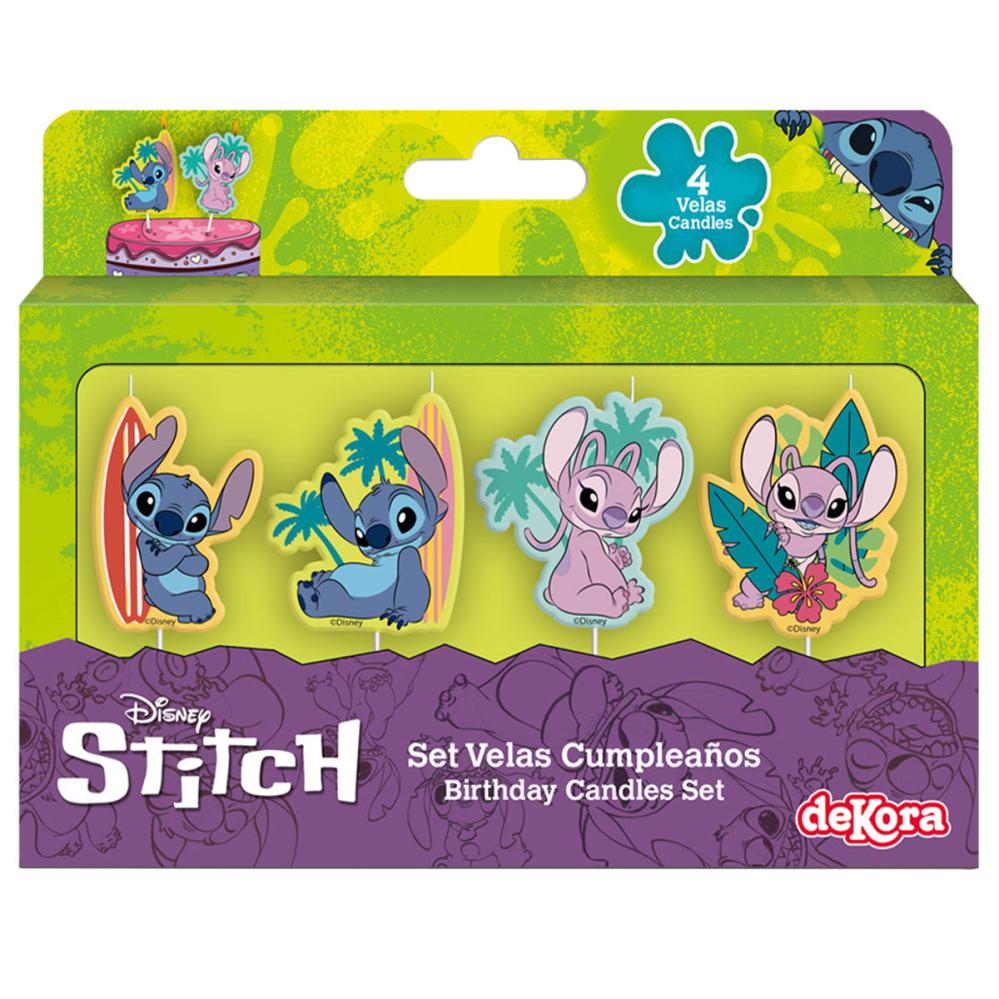 Stitch & Angel Kagelys 4-pak er en pakke, der indeholder 4 stk. farverige kagelys med motiv af Stitch og Angel - de charmerende rumvæsener fra Disney-filmen Lilo & Stitch. Lysene har også en hvid plastpind nederst, som gør det nemt at sætte lysene på plads i kagen.