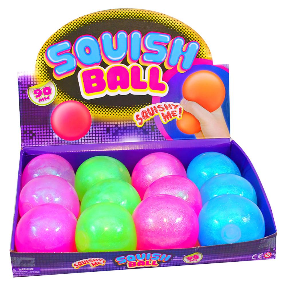 Stor Stressbold med Glitter omfatter en 9 cm stor, blød stressbold med skinnende glitter indeni. Bolden fås i rosa, blå og grøn, hvilken farve du får, er tilfældigt.