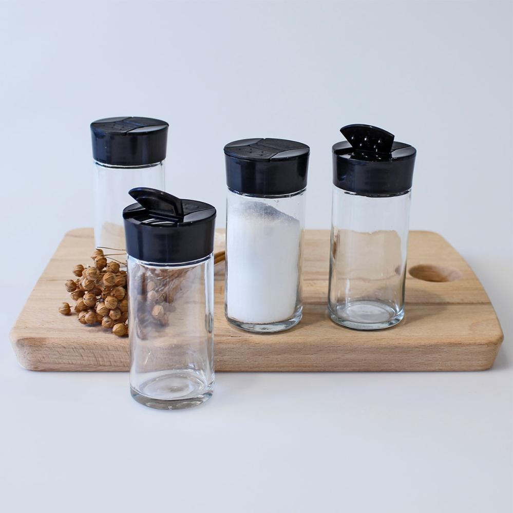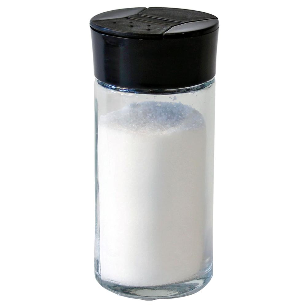 Strøer i Klart Glas 65 ml omfatter et lille glas med et sort låg med dobbeltåbning, som muliggør både drysning og hældning.