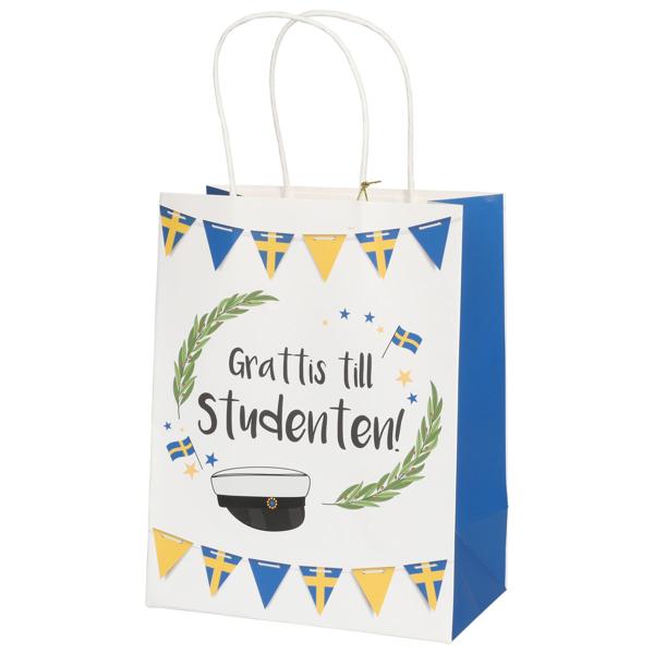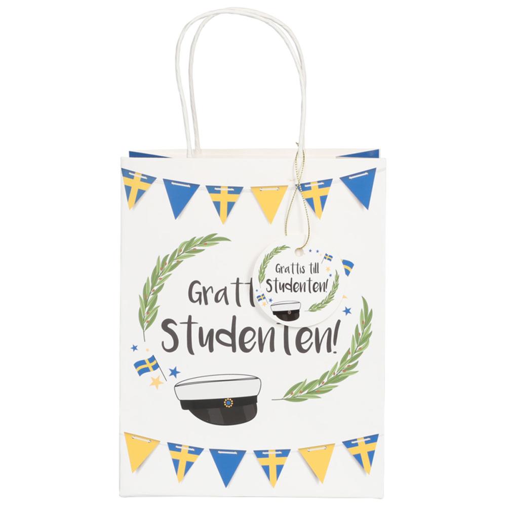 Student Gavepose Guirlande 18 x 10 x 23 cm er en hvid gavepose med teksten ”Tillykke med studenten!” i sort, omgivet af to grønne laurbærgrene, svenske flag, stjerner, en studenterhue samt to vimpelguirlander i blåt og gult øverst og nederst. Posen har blå sider, hvide bærehåndtag og en hvid rund etiket med et matchende motiv og en guldfarvet snor.