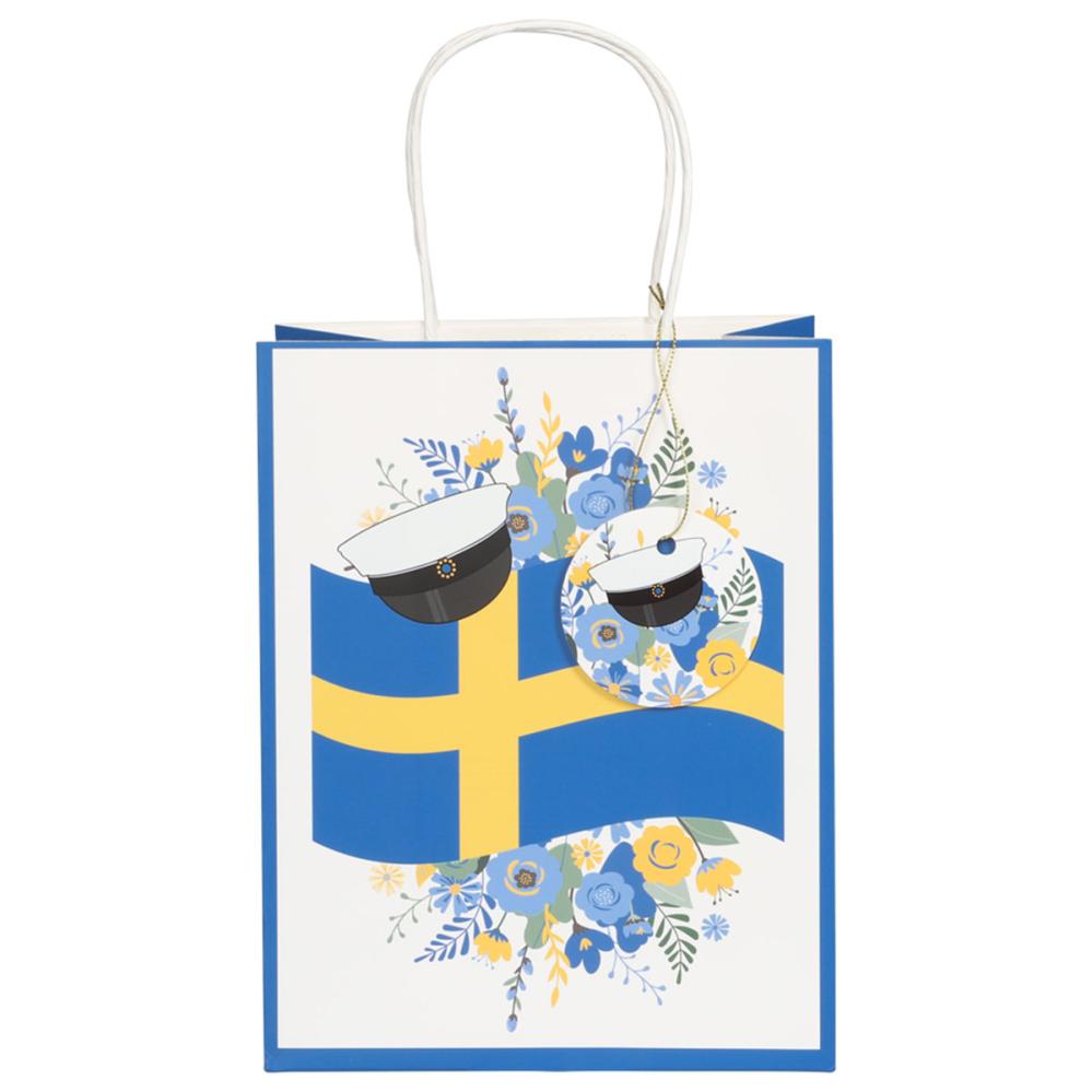 Student Gavepose Svenske Flag 18 x 10 x 23 cm er en hvid gavepose med det svenske flag, blomster, en klassisk studenterhue og en blå kant hele vejen rundt. Posen har blå sider, hvide bærehåndtag og en hvid rund etiket med blomster og en studenterhue, som har en guldfarvet snor.
