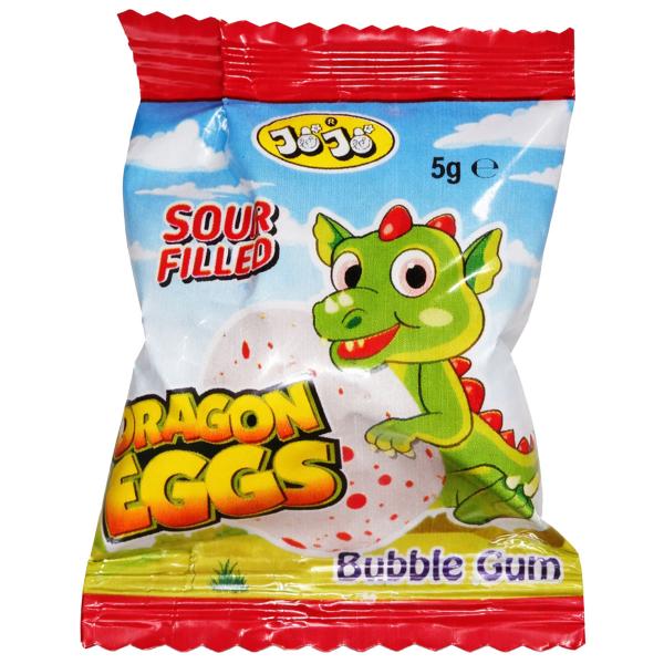 Surt Tyggegummi Drageæg 5g er et indpakket tyggegummi med sur fyldning og motiv af et drageæg.