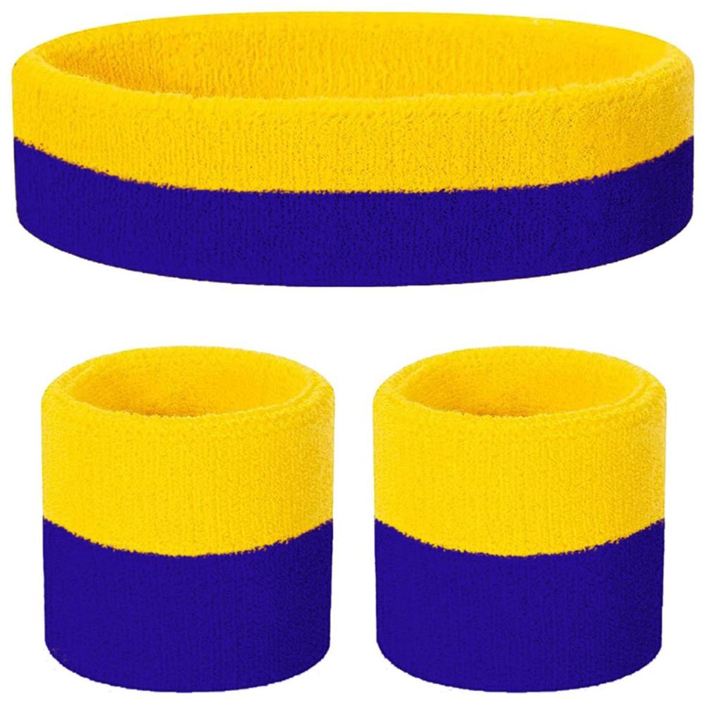 Svedbånd Blå/Gul 3-pak består af to håndledsbånd og et pandebånd i blå og gul.